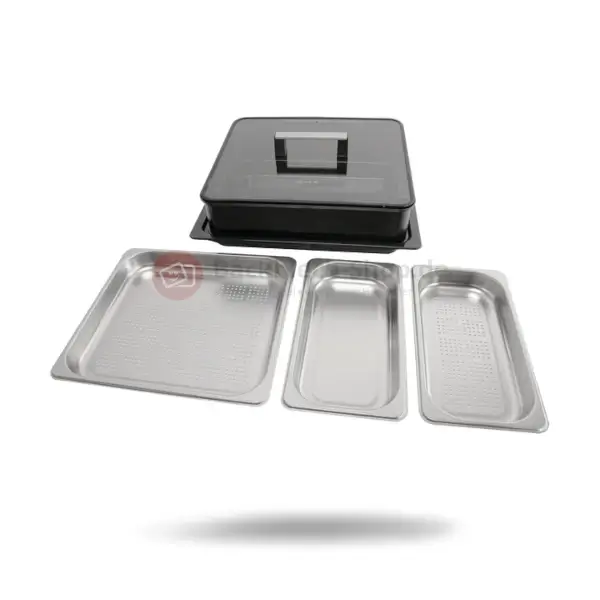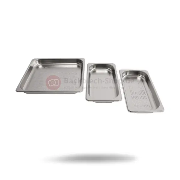 - Gelochter Dampfbehälter Größe L, 1 gelochter, 1 ungelochter Dampfbehälter Größe S aus Edelstahl.