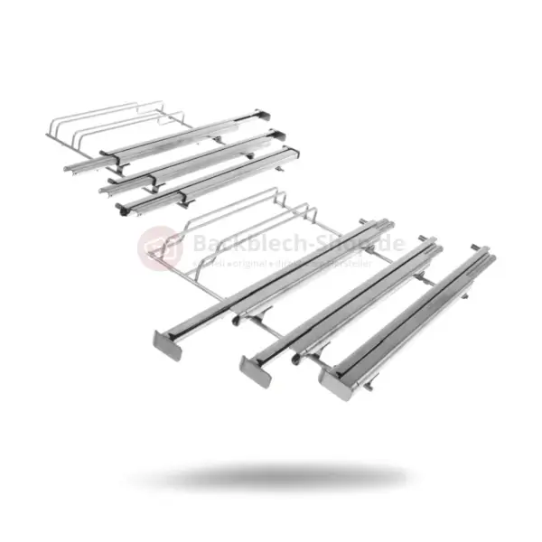 - Mit den Teleskopschienen auf den Ebenen 1, 2 und 3 kann das Zubehör ohne Umkippen aus dem Ofen herausgezogen werden